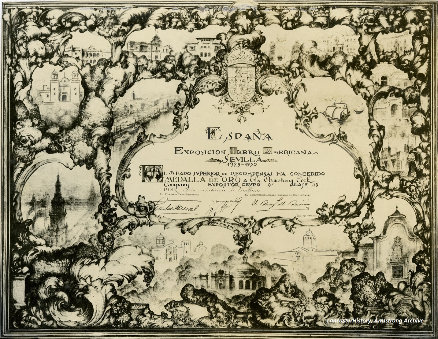 An official World’s Fair as designated by the Bureau of International Expositions (BIE), the Ibero-American Exposition was held in Seville, Spain from May 9, 1929 until June 21, 1930. The fair highlighted the historical ties between Spain and many countries of the world and sought to improve relations between Spain and all countries in attendance. By 1929, Armstrong already had a long association with the city of Seville. Beginning in the late nineteenth century, Armstrong used the city as a base of operation for purchasing, processing, and shipping cork. By the time of the exposition, Armstrong had offices, warehouses, and specialized manufacturing facilities in Seville.