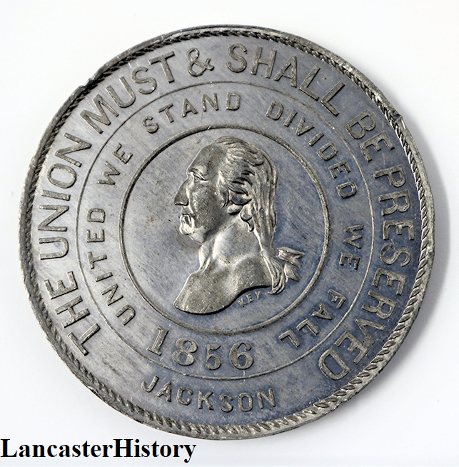The images and symbols used in this 1856 presidential campaign medal give evidence to Buchanan’s intent to preserve the Union while at the same time support what he considered to be the constitutional safeguards for the practice of slavery. Measuring 13/4” in diameter and 1/8” in depth, the obverse (front) of the white metal medal features a left-facing profile bust of George Washington surrounded by the words “United We Stand Divided We Fall/1856.” In the United States, the earliest use of the phrase is attributed to John Dickinson in 1768. The outermost part of the obverse features the phrase “The Union Must & Shall Be Preserved/Jackson.” This phrase (or a version very close to it) is attributed to a toast made by Democratic President Andrew Jackson in April 1830 at a dinner celebrating Democratic unity – both party and country – in response to the concept of state nullification of federal laws.