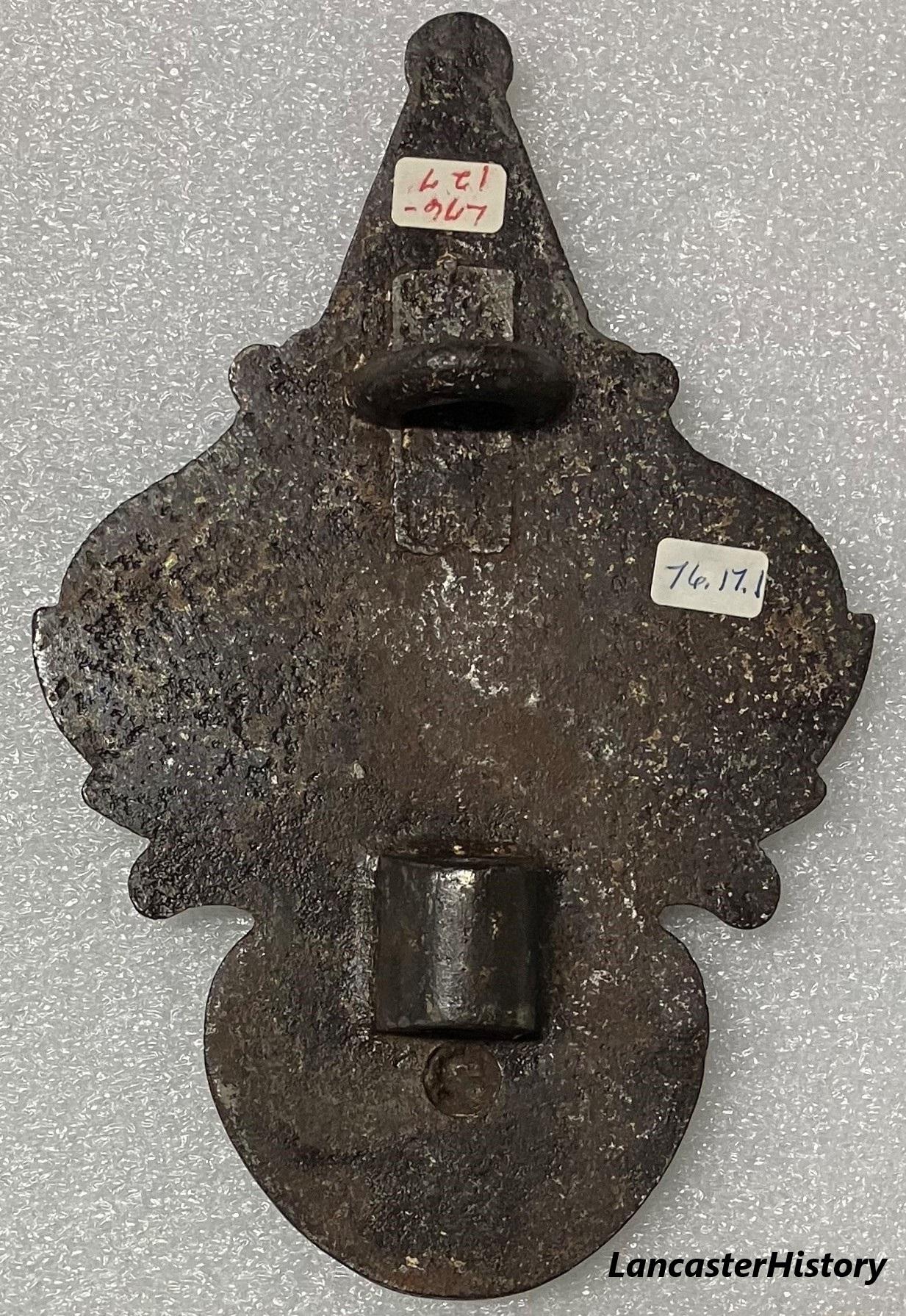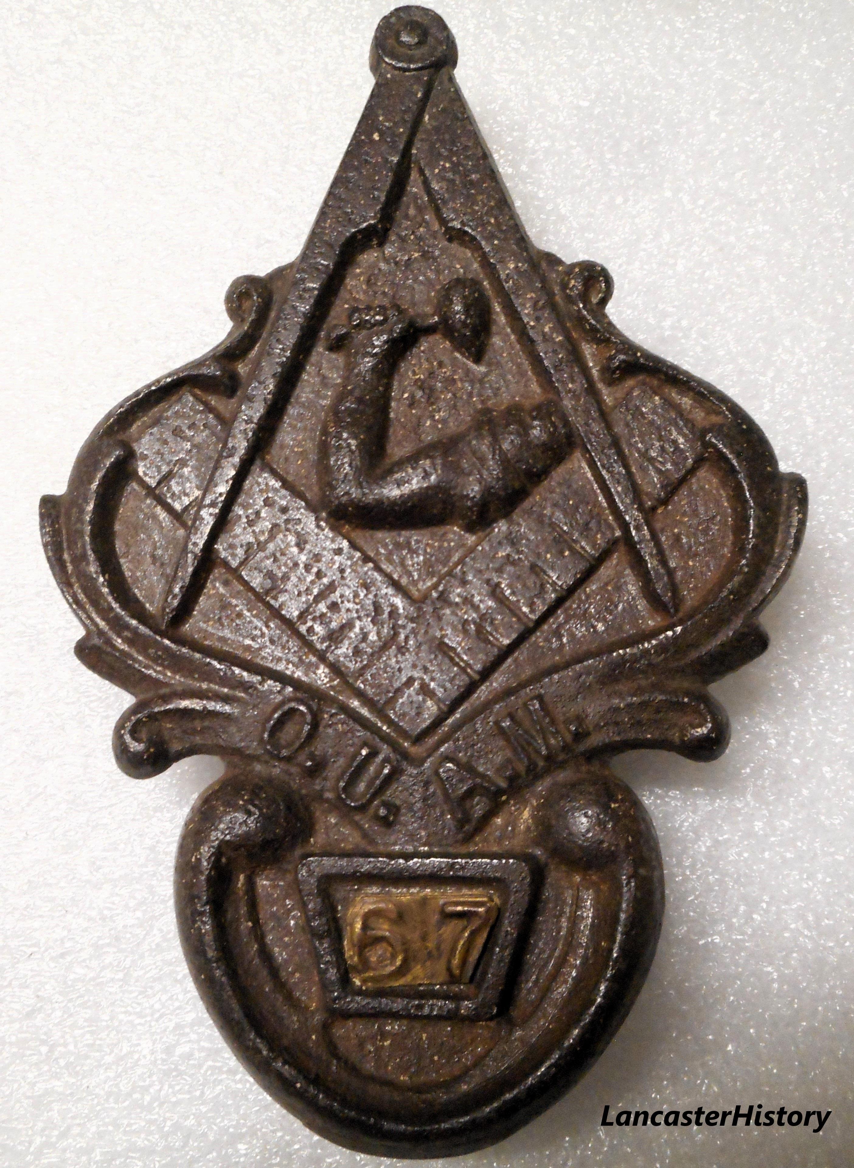 The front of this iron grave marker is decorated with the symbol of the Order of the United American Mechanics (O.U.A.M.) secret fraternal society. A small keystone-shaped insert at the base of the marker includes the number “67,” indicating it was intended for use by North Star Council #67 of Quarryville, Lancaster County. Molded into the back of the marker are two half loops. The threaded bottom half loop allows the marker to be attached to a corresponding threaded road placed in the ground. The smooth top half loop provides an opening for a flag to be attached.