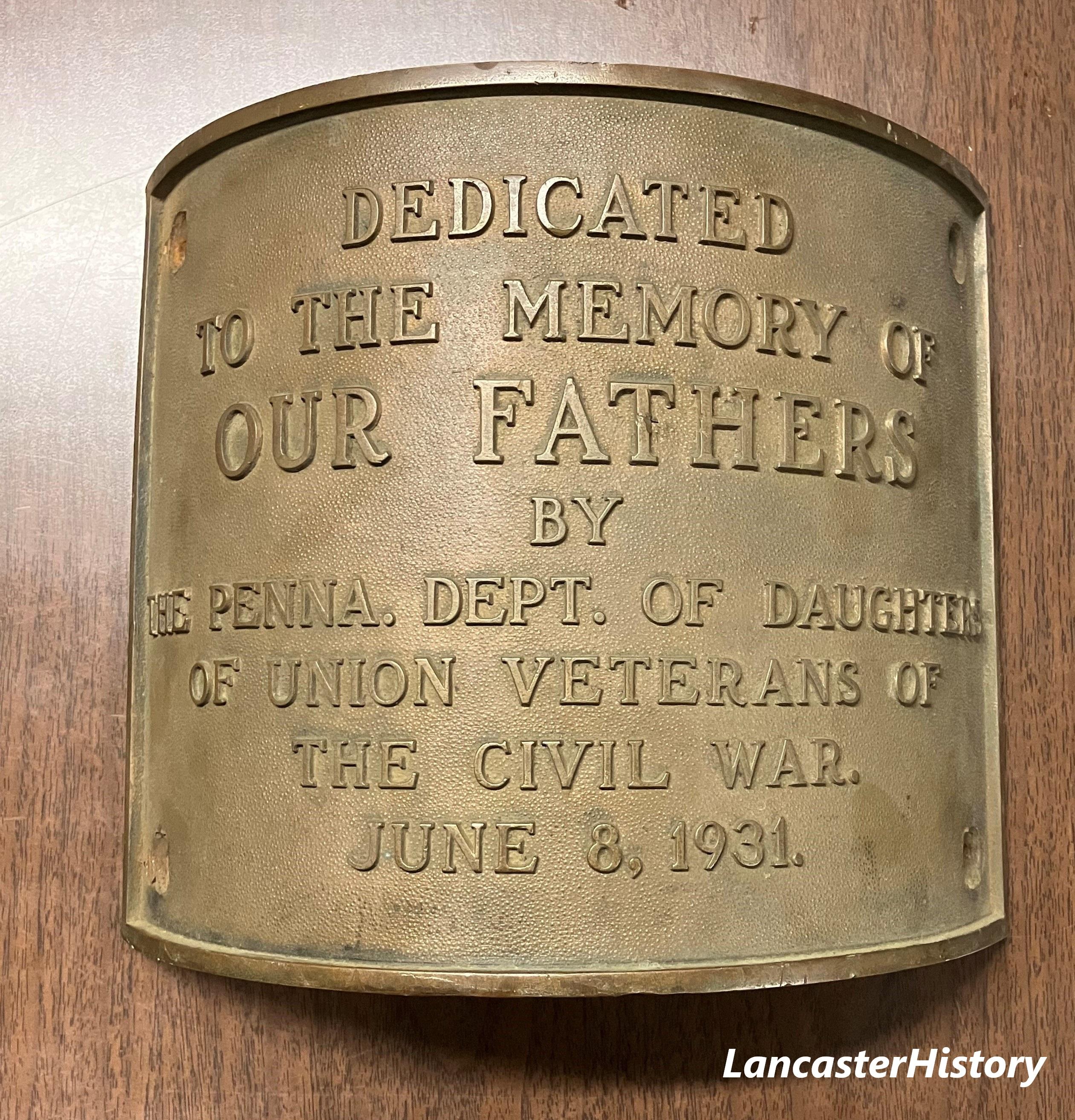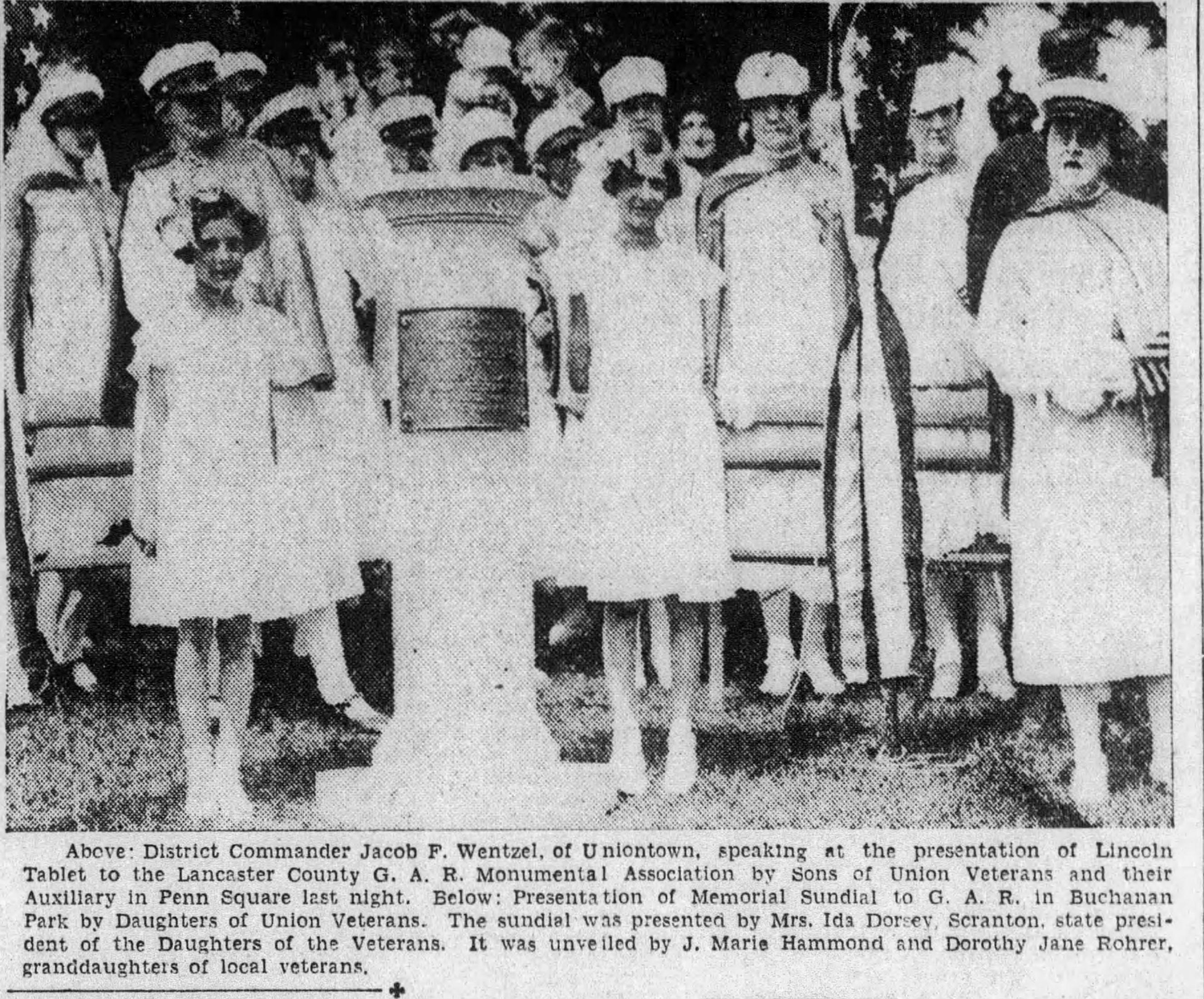 Daughters of Union Veterans of the Civil War (DUVCW) placed this curved bronze plaque on a memorial column and sundial in Buchanan Park as part of the proceedings of the 65th annual encampment of the Grand Army of the Republic, Department of Pennsylvania, held between June 7 and June 14, 1931. The formal presentation of the sundial was made on June 8 by Mrs. Ida Dorsey of Scranton, state president of the DUVCW. J. Marie Hammond and Dorothy Jane Rohrer, two granddaughters of local veterans, unveiled the sundial. Two Civil War veterans—Washington F. Hambright of Lancaster and Assistant Adjutant General Samuel F. Town of Philadelphia—delivered acceptance addresses.