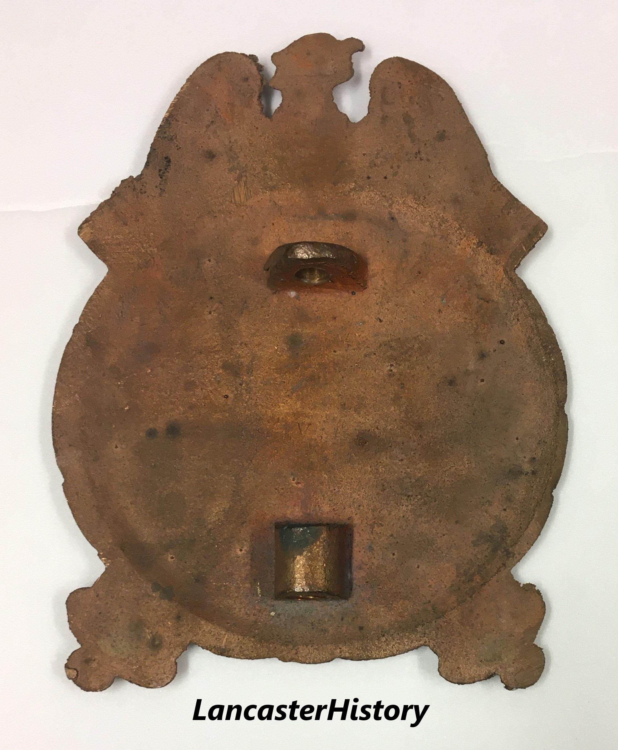 The front of this brass grave marker features an eagle over a round laurel leaf shield. The center of the shield is marked “SV” over the inscription “CAMP. No. 74.” Like the grave marker for the United American Mechanics, two half loops are molded into the back of the marker. The threaded bottom half loop allows the marker to be attached to a corresponding threaded road placed in the ground. The smooth top half loop provides an opening for a flag to be attached.