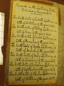 As the Bible was passed down through the family, information was recorded in English instead of French and the spelling of the surname changed from LeFevre to Lefever.