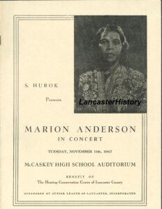 Almost a decade later, on November 11, 1947, the Junior League of Lancaster extended the invitation to Anderson to perform at J.P. McCaskey High School, with the proceeds from ticket sales benefitting the Hearing Conservation Center of Lancaster County. This would be Anderson’s first appearance on an American concert stage that season, as she had just finished touring in Cuba and Jamaica. This would not be the opera singer’s only stop in southeastern Pennsylvania. The previous year, Anderson headlined a concert at The Forum in Harrisburg and Lincoln University in Chester County honored her for her “Outstanding Contributions to the American People.”