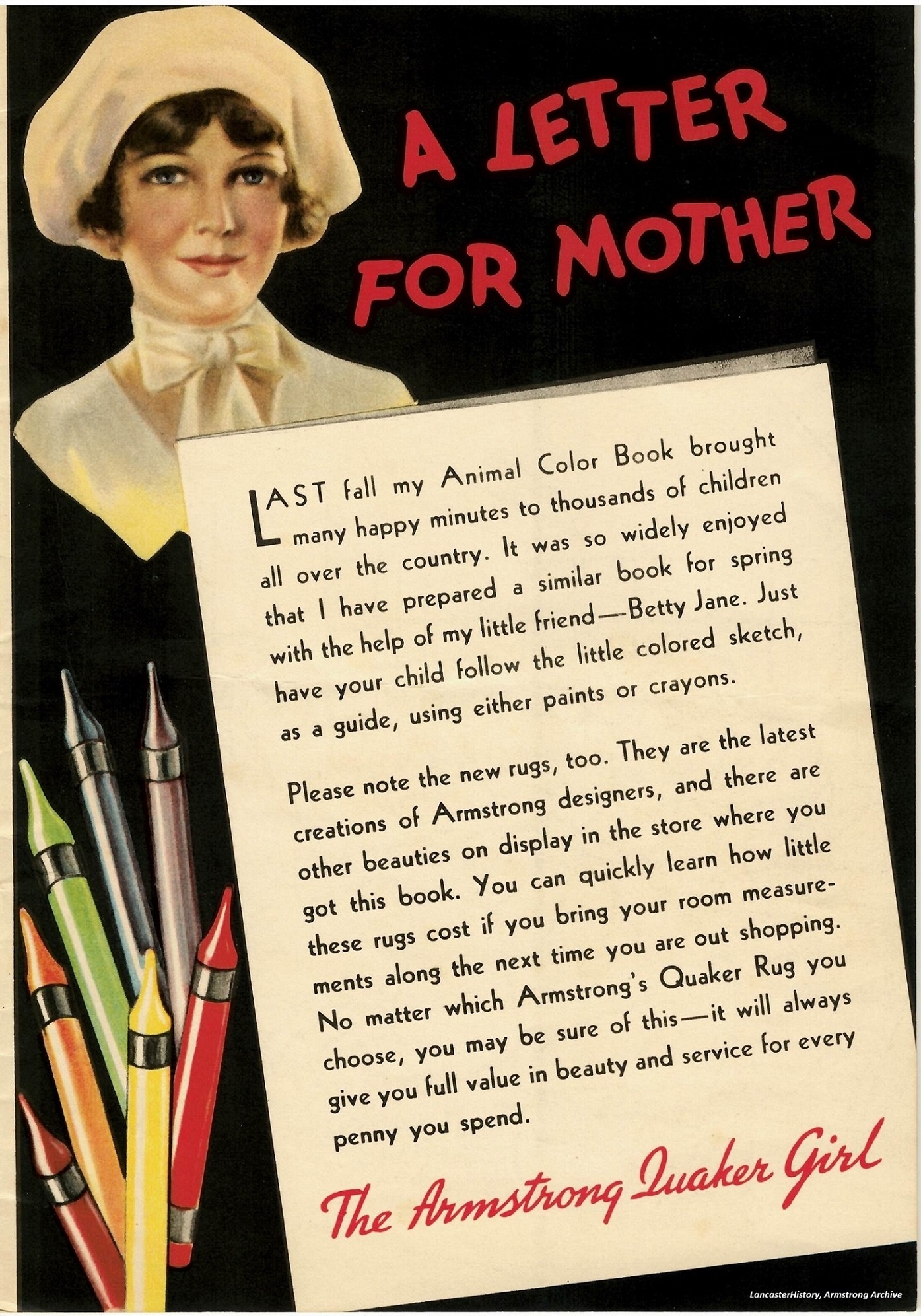 To help sell the new product to consumers, Armstrong called its new felt-base product Quaker Rugs in an effort to associate the product with Pennsylvania and the perceived Quaker values of thrift, simplicity, and cleanliness. To help promote the sales of Quaker Rugs, Armstrong chose the Quaker Girl as the personification of those values. Armstrong featured the Quaker Girl in various newspaper and magazine advertisements as well as in various promotions designed to appeal to children and homemakers. A comprehensive radio marketing and advertising plan introduced the Quaker Girl and the Armstrong Quakers, a vocal group backed by a full orchestra, to a live audience. Various radio programs sponsored by Armstrong between 1928 and 1954 featured introductions and commercials by the Quaker Girl highlighting different Quaker Rug patterns and using descriptive language to help the listener visualize the panoply of available colors and patterns.