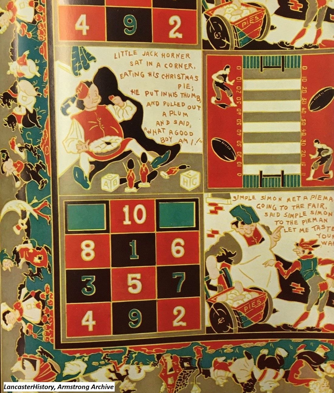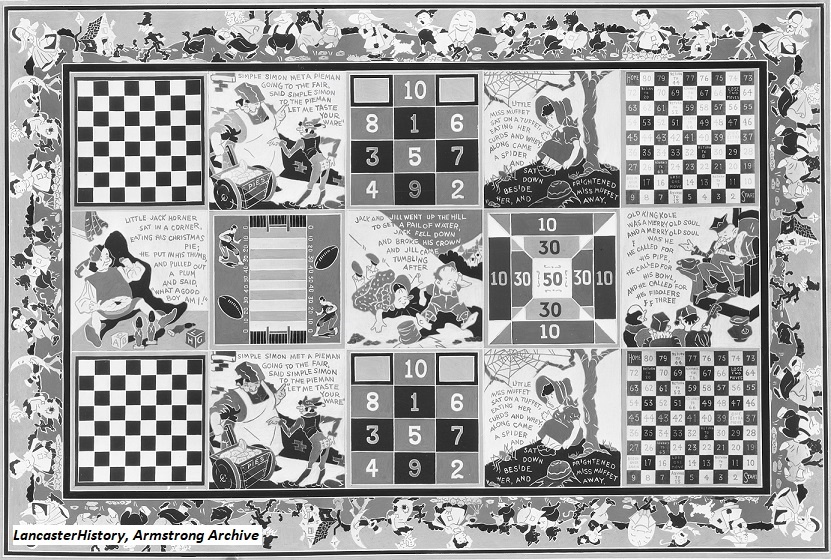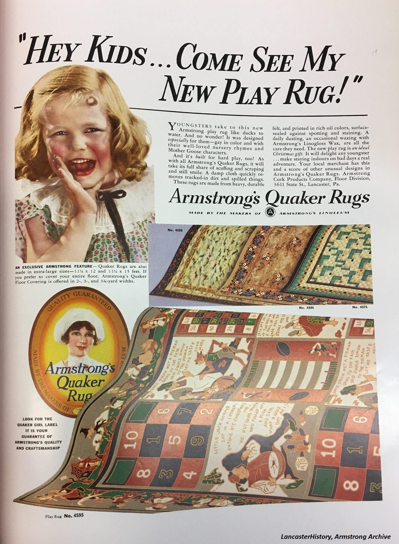 Armstrong introduced Play Rug pattern 4595 in 1936. The Armstrong Line flooring pattern book for 1937 described Armstrong’s Quaker Rugs as “bright, colorful, long-wearing, and easy to clean. These rugs are made with the same care and skill that go into the manufacture of Armstrong’s Linoleum. They are beautifully printed in rich oil colors on good thick felt.” The pattern book further describes Play Rug 4595 as “the most novel ever offered in the Quaker Rug Line. It combines the utility of a good floor covering with an entertainment feature for children. Nursery rhymes and ‘boards’ give it an appeal not to be had in other rugs.” The pattern could be had in various sizes designed to accommodate almost any room. Armstrong designed the Play Rug so children could amuse themselves all day long looking at Mother Goose characters, repeating familiar nursey rhymes, or playing various games.