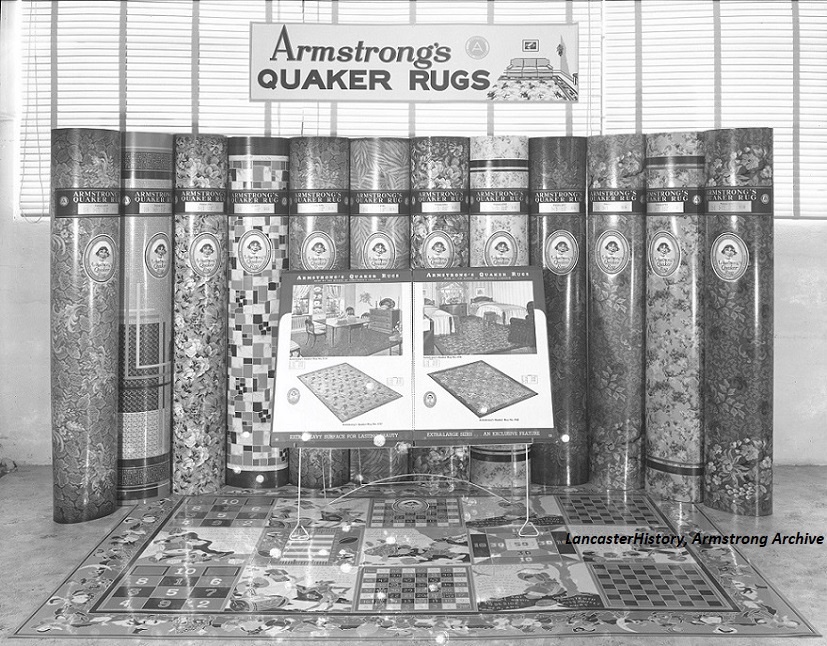 Armstrong Cork Company began to produce linoleum flooring in Lancaster in 1908 as a way to use excess cork produced by cutting round corks from rectangular slabs of corkwood. The ingredients of linoleum—oxidized linseed oil, cork dust, and organic resins—were combined to form a uniform layer attached to a woven burlap backing. In 1925, Armstrong introduced felt-base flooring as a more affordable alternative to printed linoleum. Similar in appearance to linoleum, felt-base took its name from its core, rag felt saturated with asphalt. In 1927, Armstrong introduced a new lacquer finish they called Accolac that improved wear, provided an attractive sheen, and better protected the face against damage. The Armstrong Line flooring pattern book for 1927 advised the retailer that felt-base Quaker Rugs “should help retailers to meet the needs of that class of trade that cannot afford to buy genuine linoleum” while at the same time assuring the retailer that these same flooring materials “are made of heavy roofing felt, saturated with asphalt, with a design printed on the surface and a waterproof coating on the back” and “are, in their class, as markedly superior as to design and quality as are Armstrong Linoleum Rugs.”