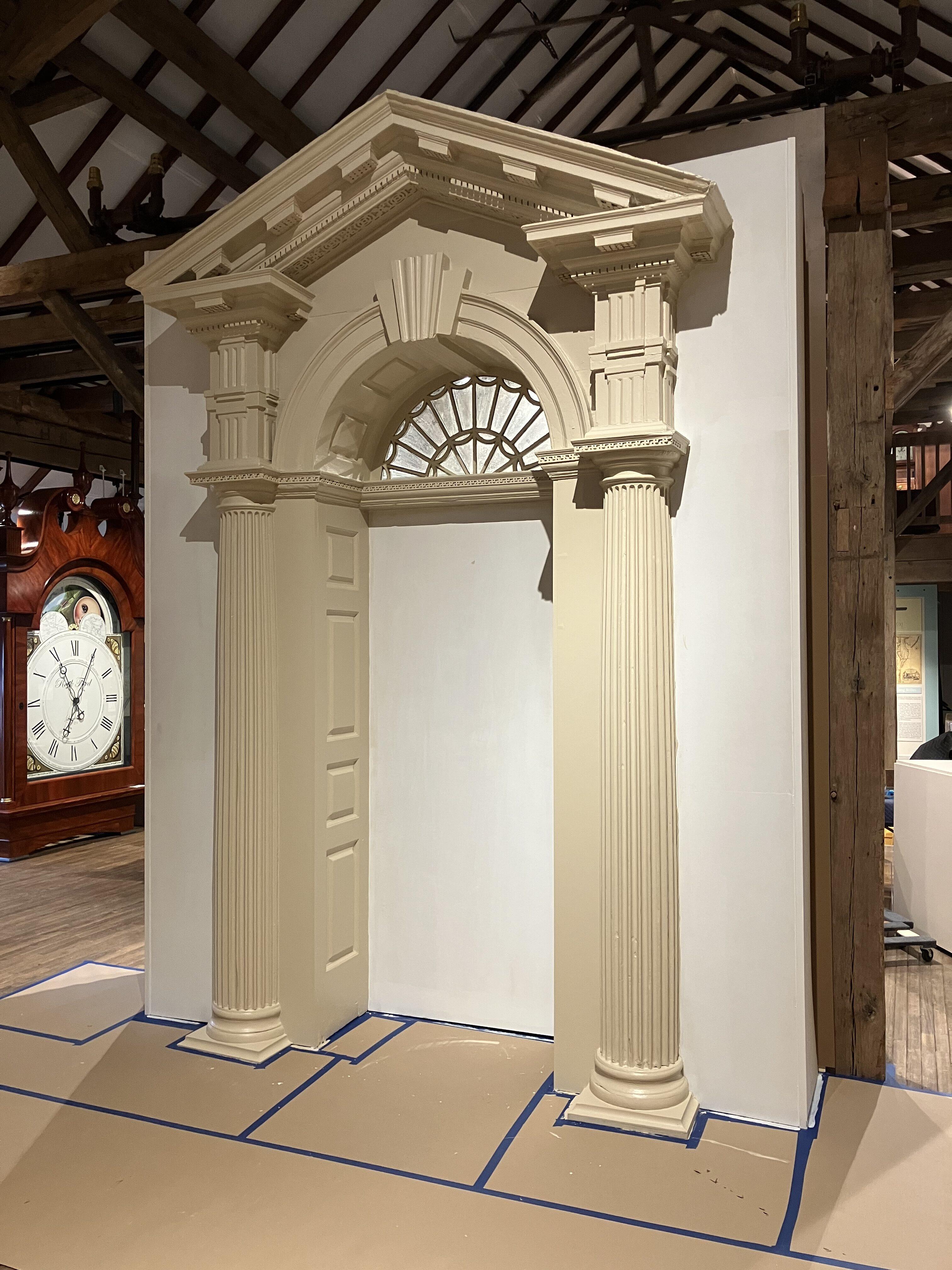 The doorframe from the colonial-era George Ross home is finally in place! Although it has undergone a number of repairs and changes over the years, it still remains one of the most important and elaborate architectural elements to have survived from the eighteenth century. The much traveled doorframe not only graced the home of George Ross but was later incorporated into the home of his great-granddaughter Ann Coleman Hopkins. Following demolition of that home in the early 1960s, the piece was put in storage for many years before being placed on display in the Heritage Center Museum of Lancaster County. Put in storage once again when the Heritage Center closed at the end of 2011, the piece is now on loan to Historic Rock Ford, the home of General Edward Hand, as a centerpiece for their Lancaster’s Revolutionaries display opening April 1 in the John J. Snyder, Jr. Gallery of Early Lancaster County Decorative Arts.