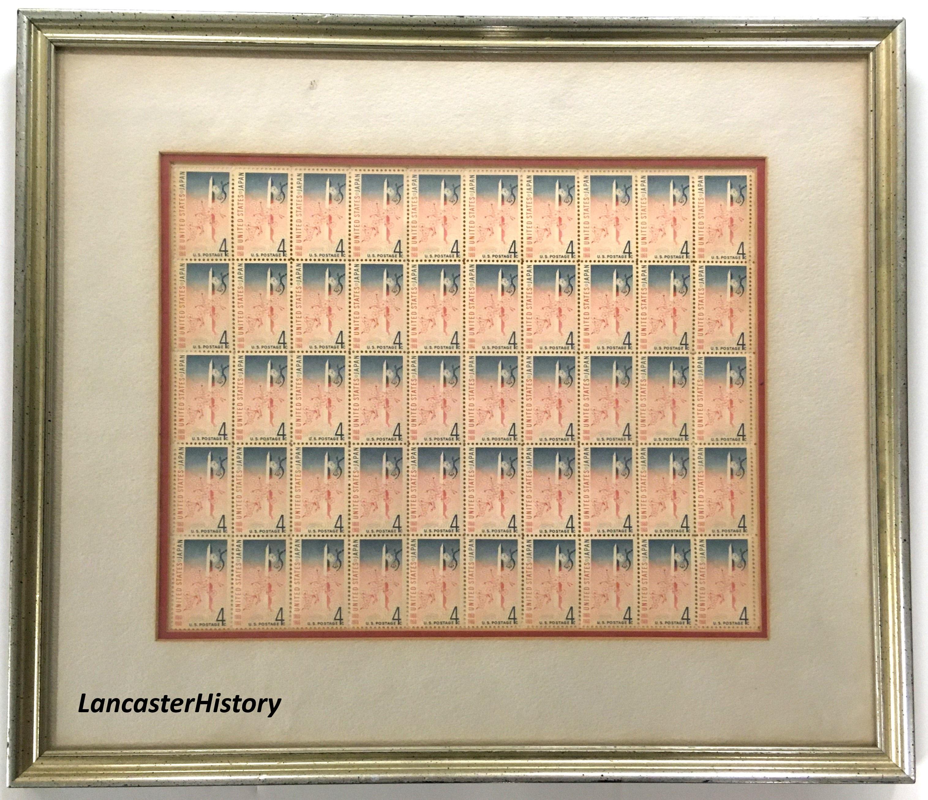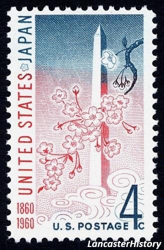 On September 28, 1960 the United States Post Office issued a 4-cent first class stamp to commemorate the centennial of the Treaty of Amity and Commerce between the United States and Japan. That 1860 treaty officially opened trade between the two countries, provided for diplomatic relations, and opened five Japanese ports to American ships. The stamp features an image of the Washington Monument and Japanese cherry blossoms. The cherry blossoms featured on the stamp are symbolic of the over 3000 trees that Japan gifted to the United States in 1912 as a symbol of friendship and ongoing cooperation.