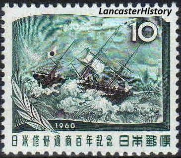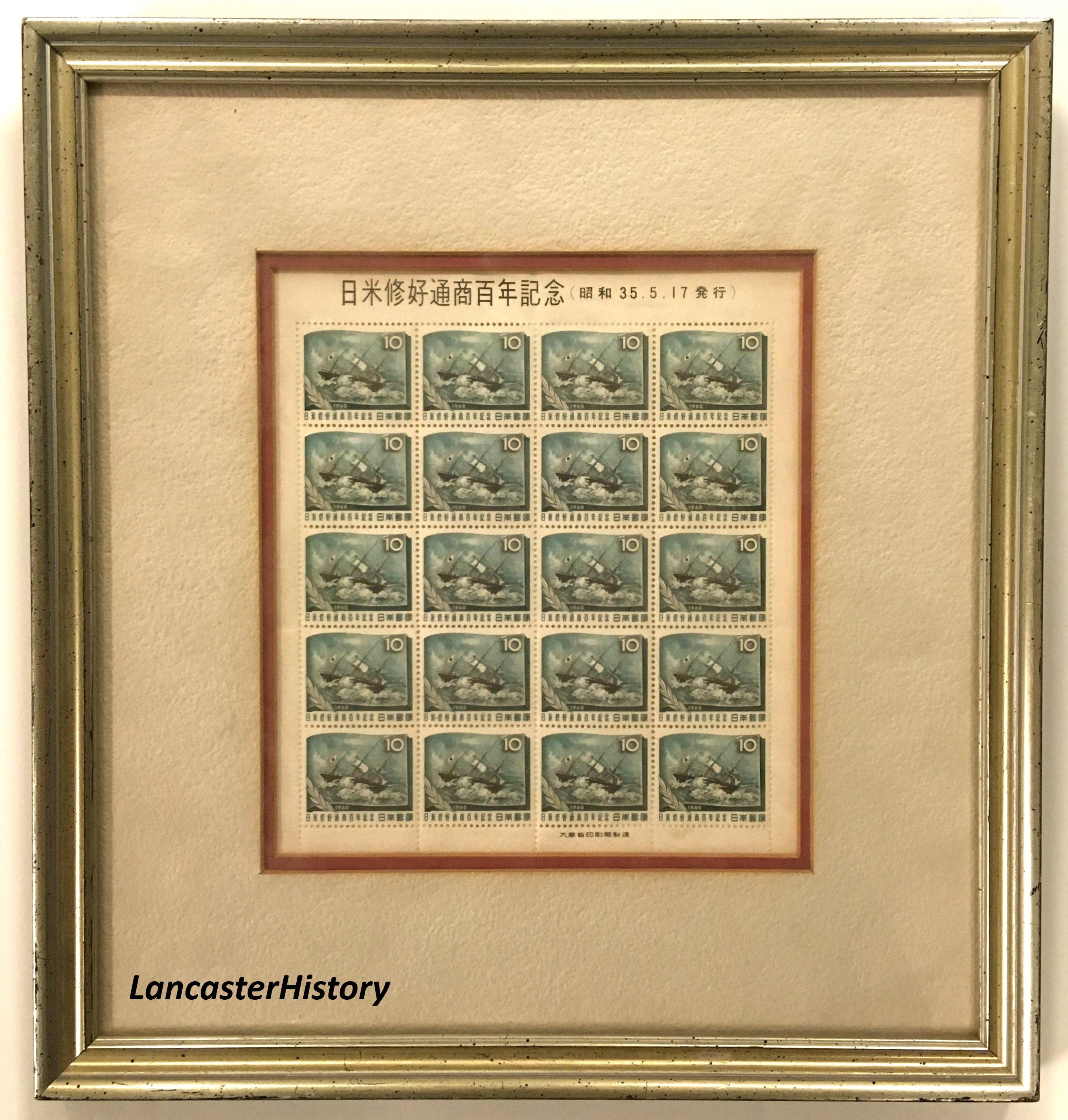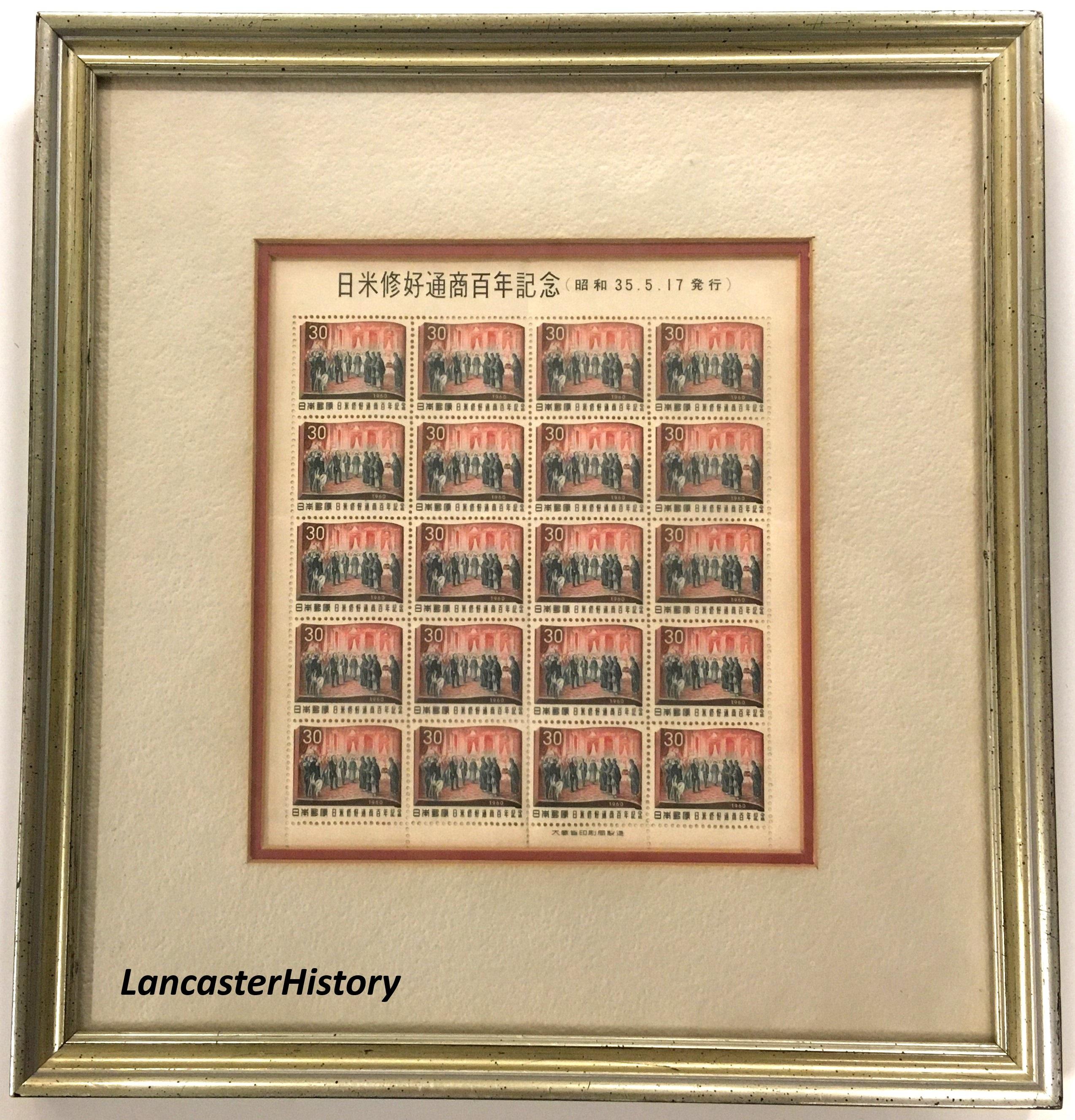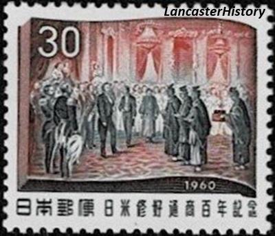 Japan issued two stamps in commemoration of the 100th anniversary of the treaty between Japan and the United States. The ship pictured on the 10-yen stamp is the Kanrin Maru, the Japanese ship that accompanied the American ship Powhatan on which the first Japanese delegation (referred to as an embassy) traveled. After arriving in San Francisco, the Japanese mission continued by boat to Panama (rather than across the continent), crossed the isthmus by train, and again traveled by sail to Washington where they met with President James Buchanan. The image pictured on the 30-yen stamp is taken from a colorized wood engraved image from the May 26, 1860 edition of Harper’s Weekly titled “Reception of the Japanese Embassadors [sic] by the President at the White House, May 17, 1860.”