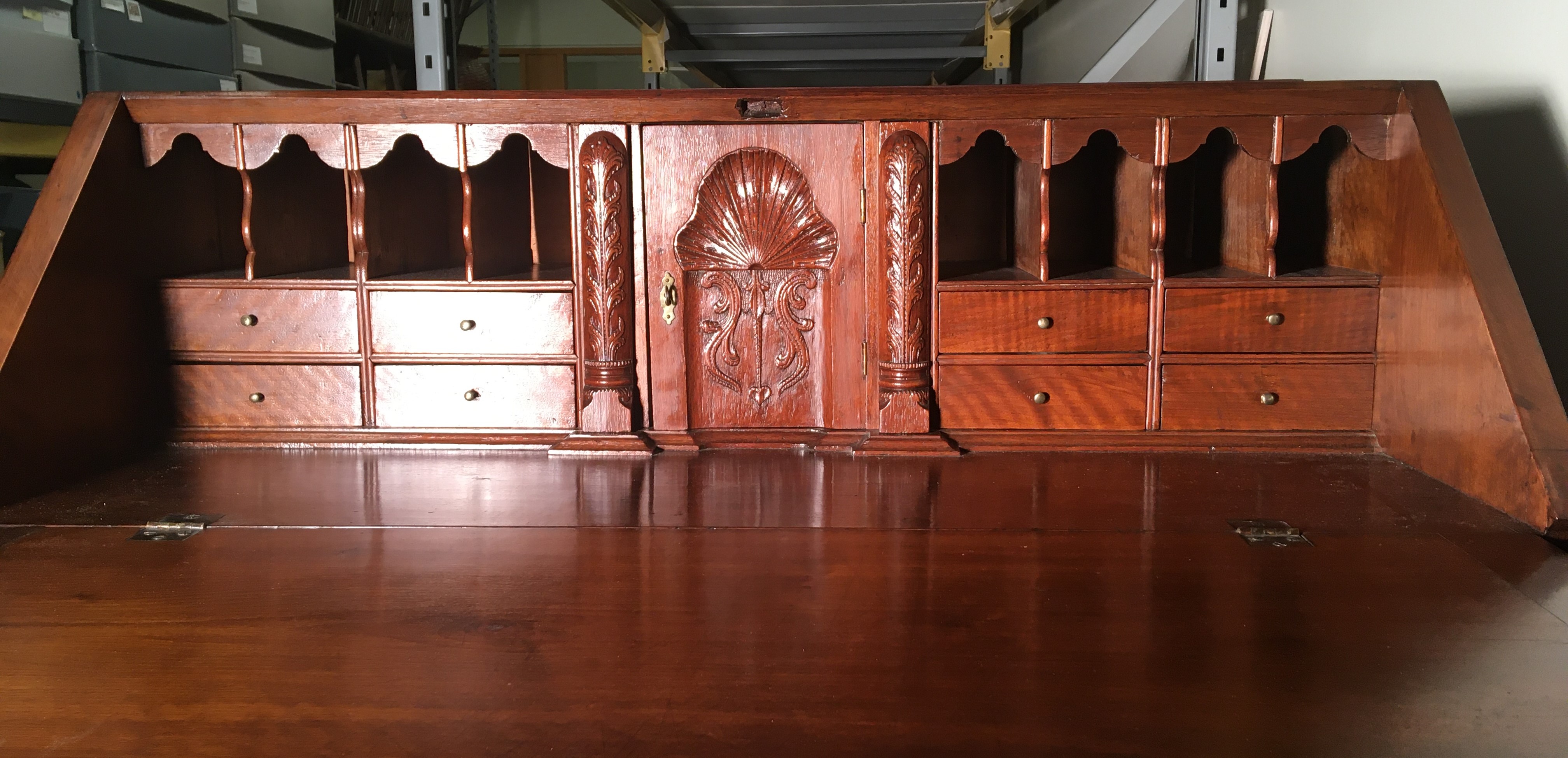 For those of you familiar with the National Treasure movie franchise, this story of a secret (but empty) compartment in a Chippendale style walnut slant-front (or slant-top) desk might seem rather ordinary. Even so, the discovery of such a compartment in an eighteenth century desk of local manufacture speaks not only to the ingenuity of local cabinetmakers, but to the sophistication and wealth of the local consumer market.