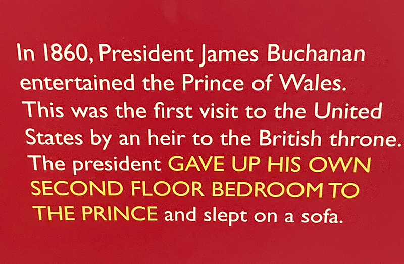 “In 1860, President James Buchanan entertained the Prince of Wales. This was the first visit to the United States by an heir to the British throne. The president gave up his own second floor bedroom to the prince and slept on a sofa.”