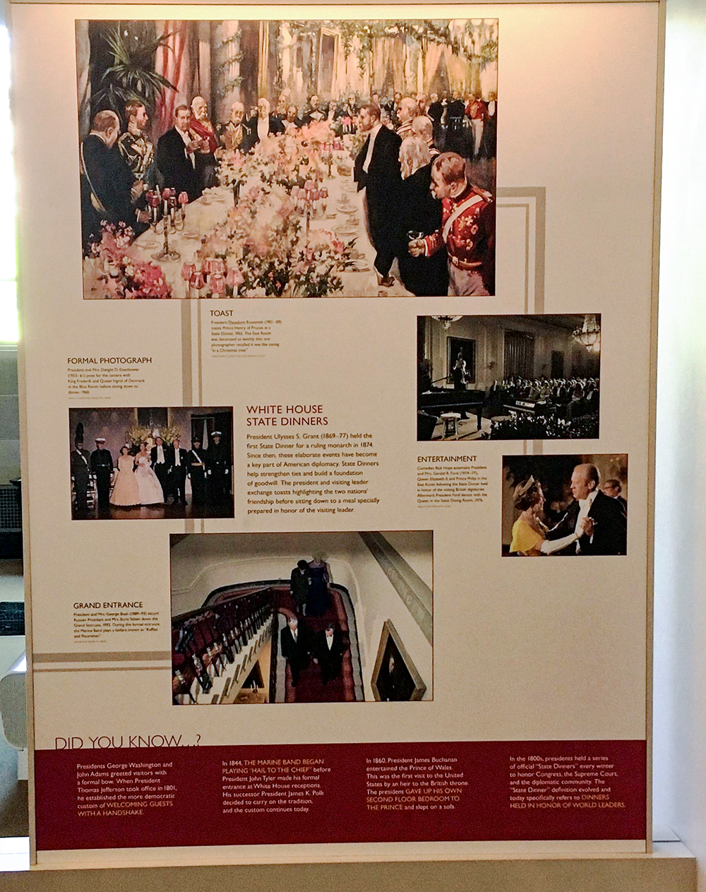 A short walk away from the White House is the White House Visitor Center. The visitor center features objects, exhibits, interpretive panels, and interactive elements designed to give visitors “alternate access” to the White House proper. An interpretive panel titled “White House State Dinners” included the following “fun fact” related to James Buchanan: